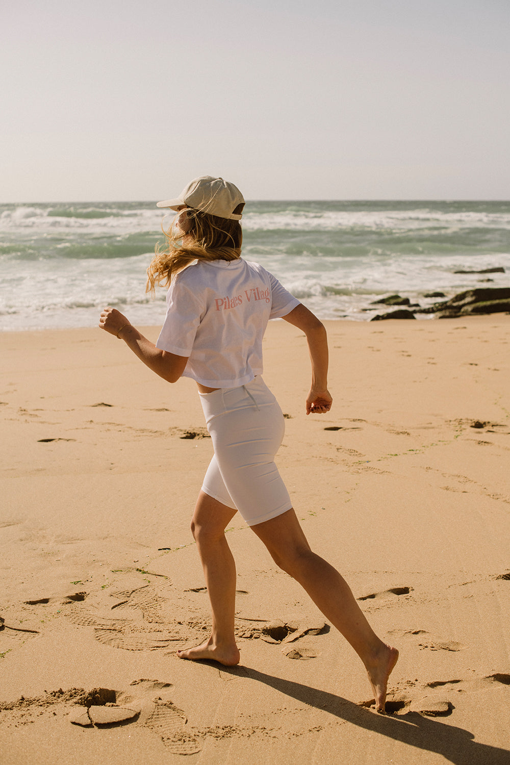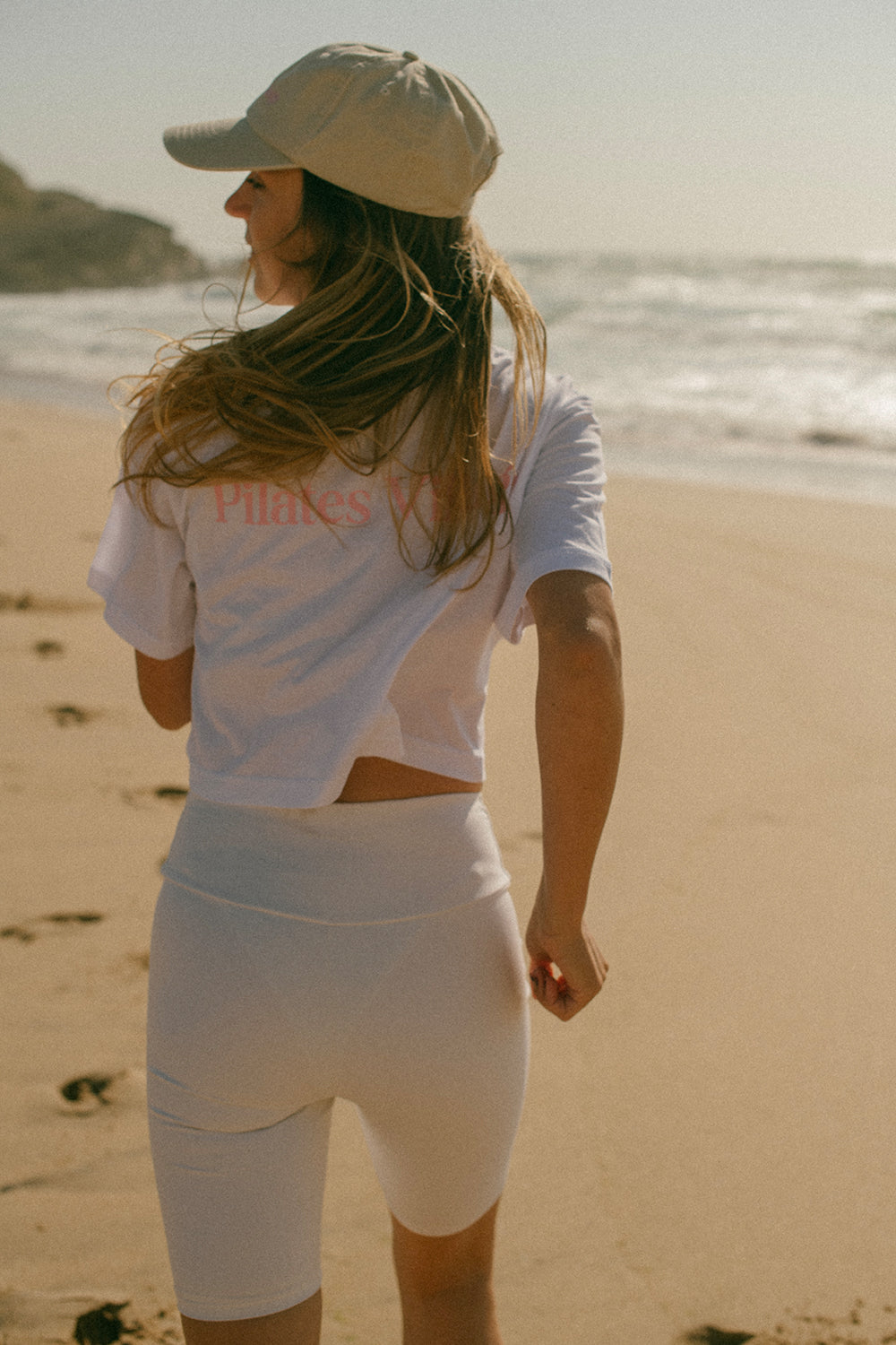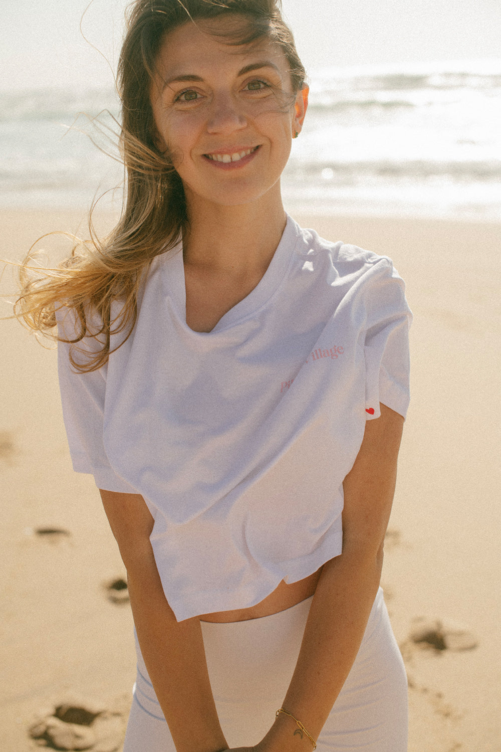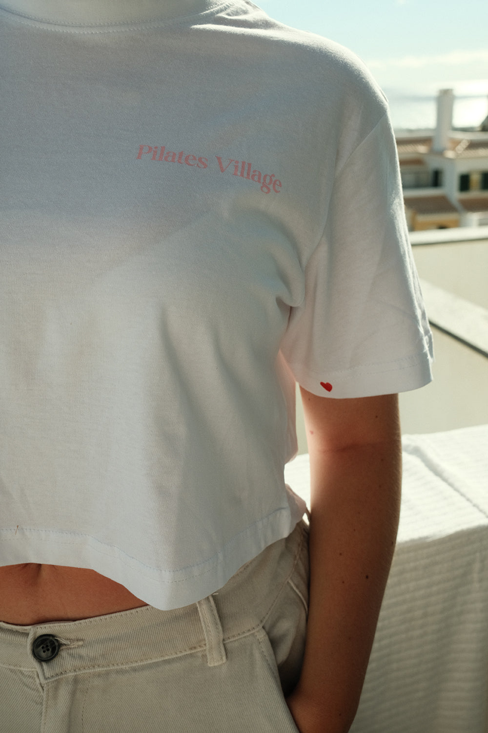 Bavlněné crop triko v bílé barvě se světle růžovým logem Pilates Village na přední i zadní straně z kolekce TASTE OF ENDLESS SUMMER. Ideální na sport i denní nošení.