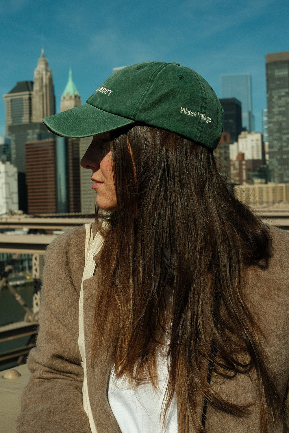 Vintage vzhled, krémová výšivka LATE CHECKOUT na přední straně a logo Pilates Village na boční straně.